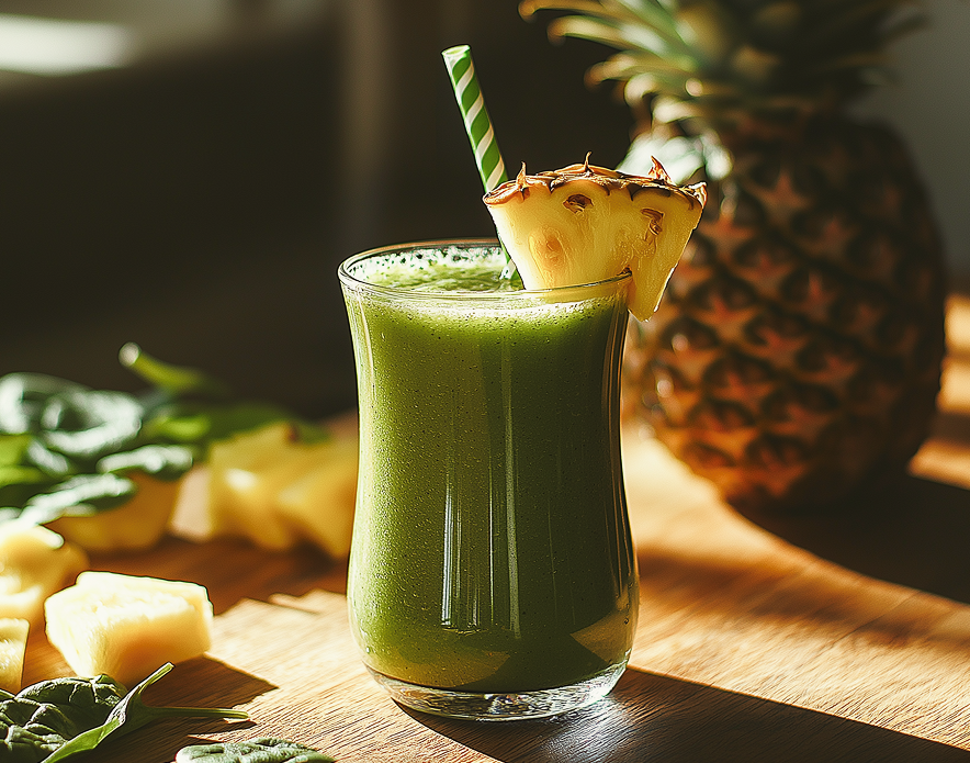 · Add the pineapple, spinach, coconut water, lion’s mane powder, and chia seeds to a blender.