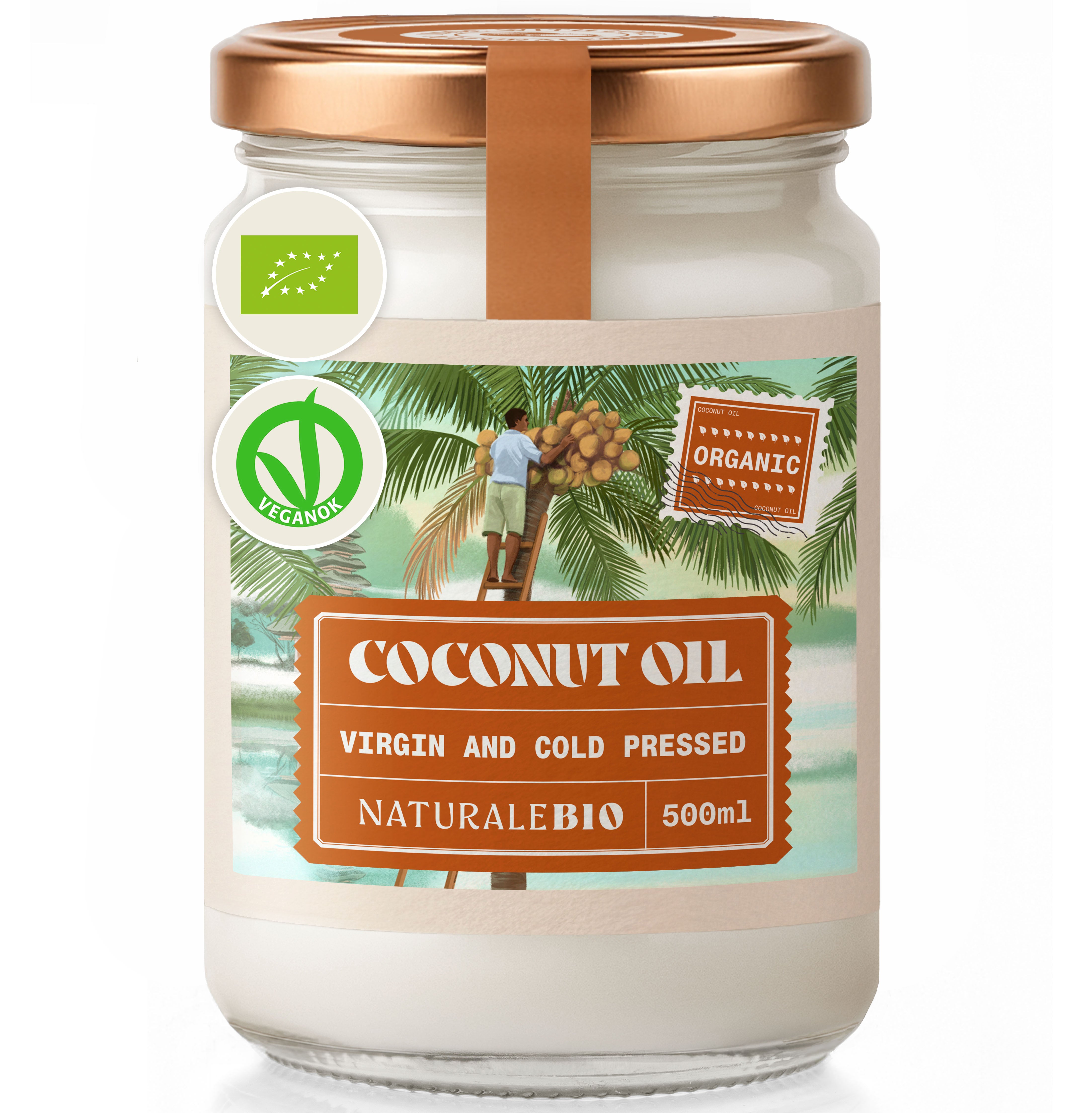 Coconut oil can be stored just like any other oil in a cool, dry place, away from direct light and heat. If you prefer to use your coconut oil in a solid form, even during the summer, you can store it in the fridge. Just make sure you take the desired amount of oil with a clean and dry spoon. To return coconut oil to a liquid form, simply hold it in your hands for a few seconds or heat the desired quantity in a glass bowl over a bain-marie.