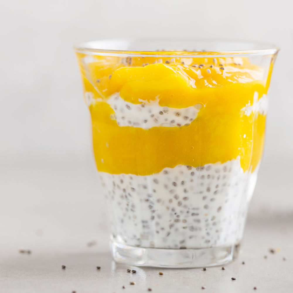In un frullatore, versare il mango a pezzi, il latte di cocco e 2 cucchiaini di olio di cocco NaturalBio. Frullare fino a ottenere un composto liscio e omogeneo. Aggiungere quindi i semi di chia e frullare brevemente per amalgamarli al frullato.
