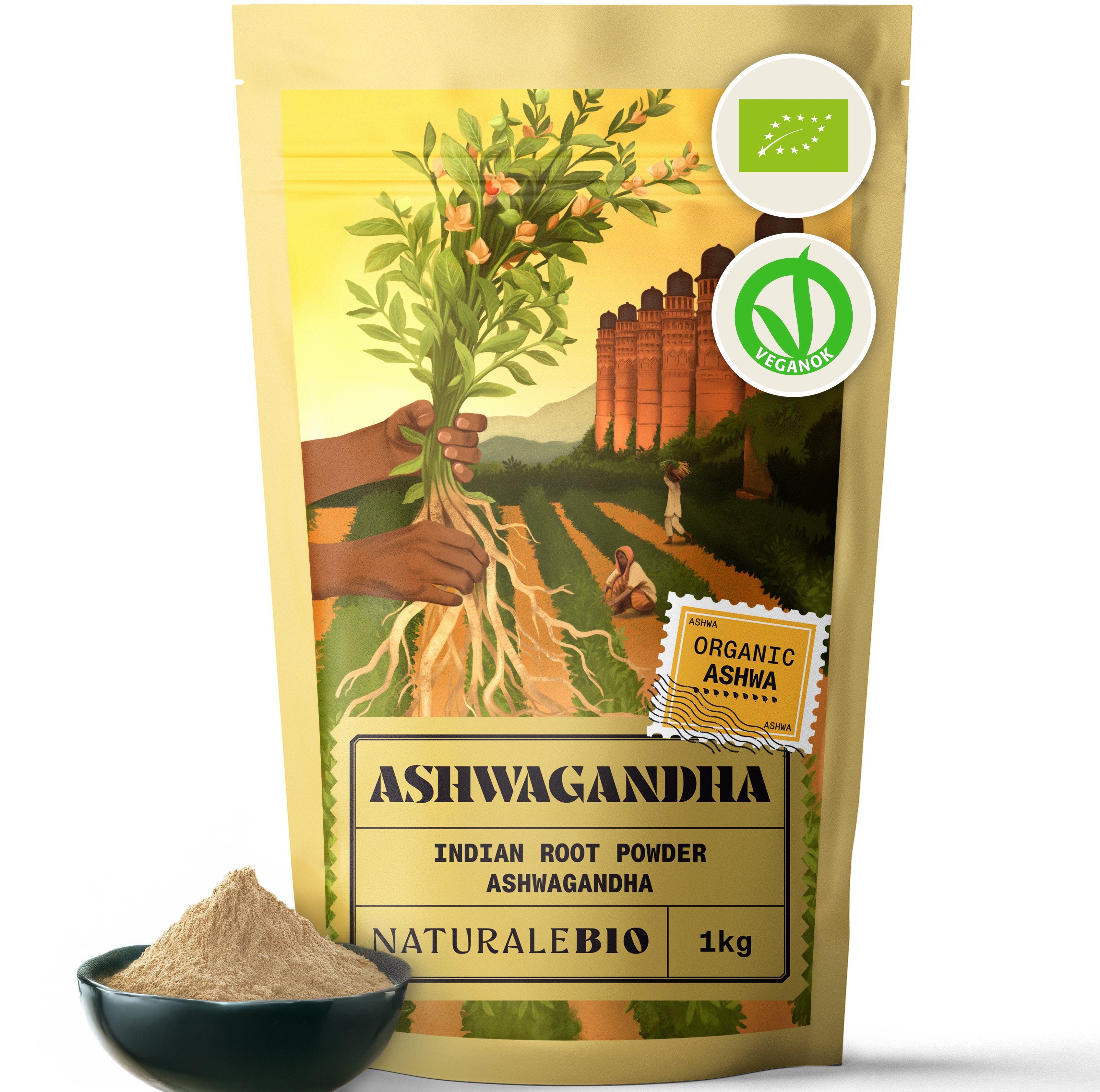 Polvere di Ashwagandha biologica. 100% biologico, naturale e puro. Prodotto in India dalla radice di Withania somnifera. Aiuta a ridurre lo stress, l'ansia e a migliorare la qualità del sonno.